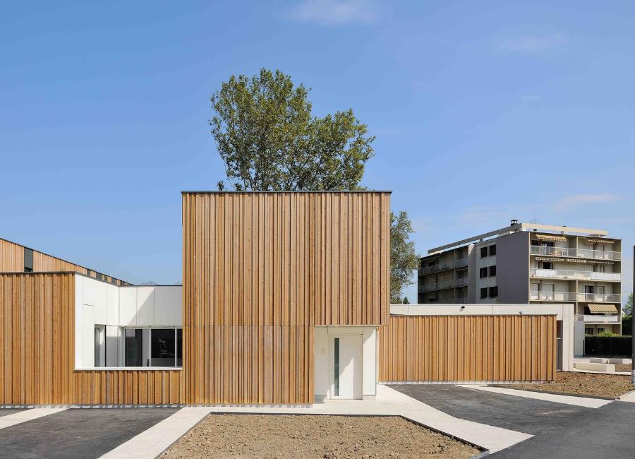 建筑二层的木质框架面板和首层的木制壁板共同构成了建筑的外壳,装饰了钢筋混凝土的结构。混凝土结构不仅使得建筑能够满足场地的抗震要求,还有利于建筑的惯性(尤其是在夏季)。不同宽度和厚度的落叶松木条作为外壳保护了建筑。就像是复合木材面板。这些不用材质制成的壁板共同组成了建筑立面。通过在加钢筋的区域使用复合木板的方式,我们可以更加小心地专注于木材的老化问题。