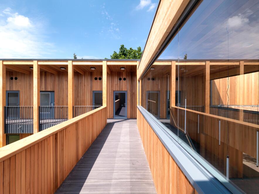 由于预算非常紧张,为满足此前设定的宏伟目标,设计从模块化和预制化的原则出发。将建筑物分成两个独立的区域,使建筑变的更加高效。在“教学区”(包括教室、办公室、公共空间和自习室)设置了很多单元空间;另一个单独的区域则容纳报告厅等空间。这两个街区通过一个二层的室外通廊进行衔接,作为主入口以及交通空间,并在底层提供了一个清晰的视线联系,将林地景观引入到建筑之中。